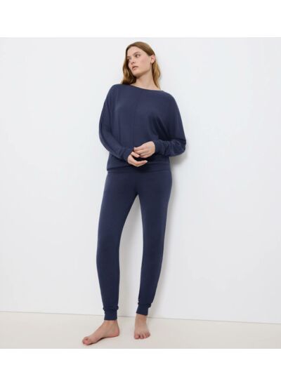 This knit-alike sweater offers a relaxed fit. Designed with bat sleeves and a boat neck, it provides comfort and style. Crafted from a soft and cosy fabric blend, made of 51% certified Lenzing EcoVero viscose and 30% recycled polyester.