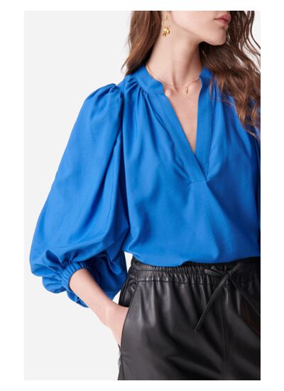 Quels sont les points forts du design de la blouse Bell ? La blouse Bell se distingue par ses fronces aux épaules, au col et aux manches, ainsi que ses poignets élastiqués qui créent un volume élégant et féminin. Sa couleur bleu roi apporte une touche de sophistication facile à associer.