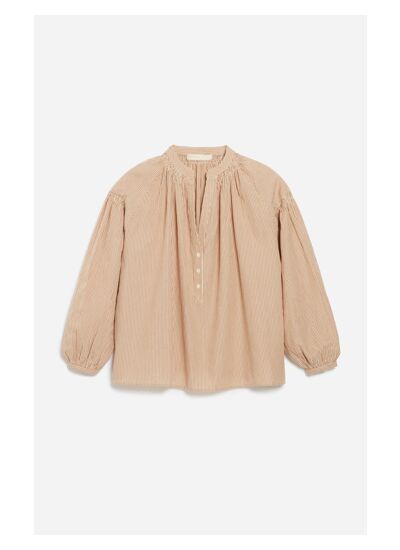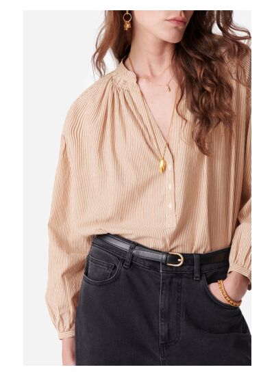 Référence produit : 0HVA06-V09117-147Quelle matière compose la blouse Nipoa et comment est-elle conçue ? La blouse Nipoa est confectionnée en 100% coton écru, offrant une texture légère et respirante. Sa viscose ultra-légère blanche est agrémentée de fines rayures marron clair fondues, garantissant confort et élégance au quotidien.