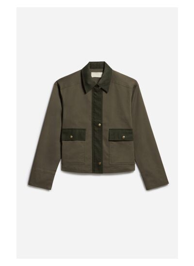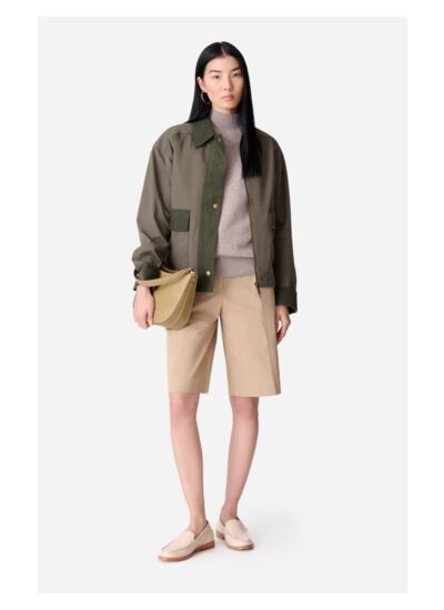 Cette veste courte en coton revisite le style utilitaire avec une touche moderne et chic. Dotée d'un col et de poignets contrastés en velours, elle se distingue par ses finitions soignées et son allure décontractée. Les poches à rabat plaquées, ornées de boutons pression dorés, apportent à la fois praticité et élégance. Confectionnée dans un coton et polyester, cet imperméable est parfait pour vos journées de pluie en ville. Sa coupe droite et ses détails minimalistes en font une pièce idéale pour la mi-saison.