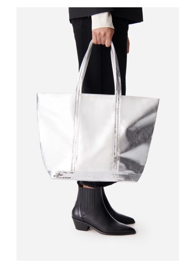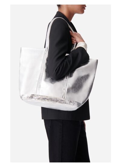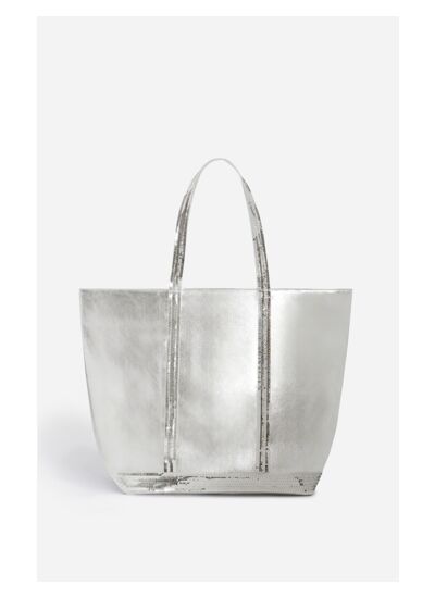 Depuis 1996, le Cabas est le compagnon le plus fidèle des femmes. Emblème de la maison, ce sac versatile et chic est réinventé à chaque saison, dans des couleurs et matières différentes. Ici présenté dans le format L, qui permet de transporter bien plus que l'essentiel. En exclusivité pour la saison des fête, ce Cabas est confectionné en Italie dans un cuir argenté, et sublimé par ses iconiques sequins ton-sur-ton.