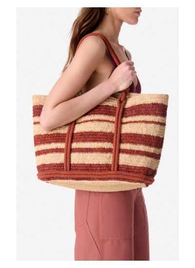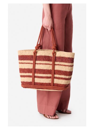 Ce cabas en raphia se distingue par son tressage rayé bicolore qui lui confère un style estival et décontracté. Ses anses en corde, nouées avec élégance, ajoutent une touche authentique et artisanale. Parfait pour transporter vos essentiels avec style, il allie légèreté et robustesse, idéal pour vos escapades ensoleillées. Cet accessoire en raphia a été tressé à la main dans notre atelier de Madagascar. Chaque modèle est unique et peut présenter d',éventuelles irrégularités dues au caractère naturel de la fibre et à la fabrication artisanale du produit.
