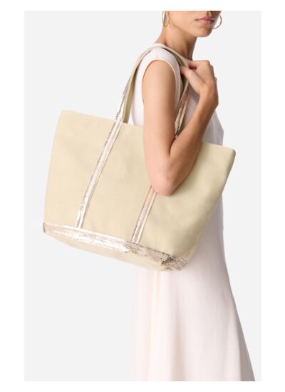 Un ordinateur portable, un dossier A4, un grand livre, une trousse de maquillage... le Cabas L Zippé est le modèle le plus polyvalent de la gamme, conçu pour transporter l',essentiel... et bien plus encore. Doté de grandes anses pour être porté à l',épaule, il dispose également d',une fermeture zippée. Lancé en 1998, ce sac en toile de coton ultra-résistante a traversé les années et est devenu un classique de la maison Vanessa Bruno. Rehaussé de sequins, il est fabriqué dans nos ateliers près de Paris, à partir de matériaux sourcés localement, et convient à toutes les femmes, de l',étudiante à la jeune maman, en passant par la businesswoman.
