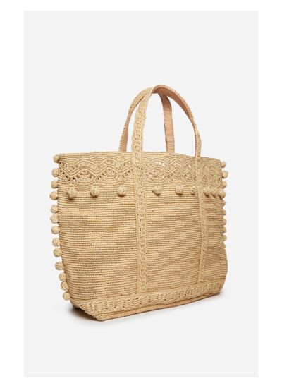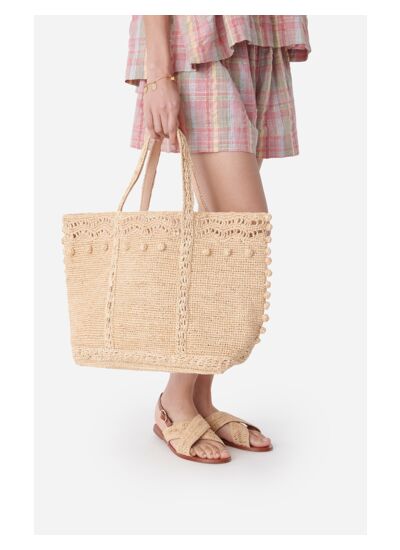 Le Cabas en raphia, aussi original que culte, se décline cette saison encore sous sa version Bulle avec un détail crocheté. Fabriqué à la main à Madagascar, ce modèle est ici présenté dans sa taille L, la plus grande, qui vous permettra d',emporter avec vous l',essentiel et bien plus encore.