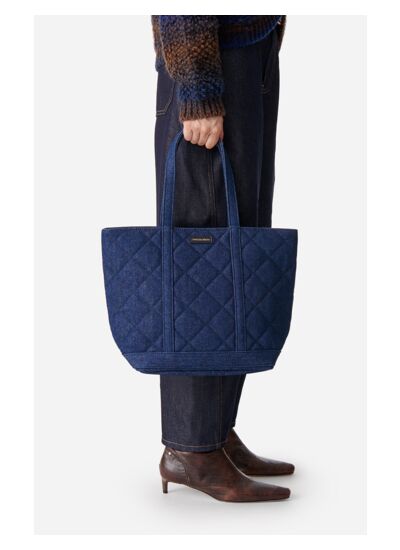 Une nouvelle déclinaison de l'iconique Cabas, emblème de la maison depuis son lancement en 1998 Vanessa Bruno arrive cette saison. Cette version en denim matelassé, versatile et léger, est le compagnon idéal. Fabriqué en France dans nos ateliers près de Paris, ce Cabas éco-responsable est confectionné avec soin pour garantir une qualité exceptionnelle. Présenté ici dans sa déclinaison M, ce sac permet d'emporter légèrement plus que l'essentiel, comme un livre et une trousse de maquillage. Trop petit pour accueillir un ordinateur portable ou un cahier grand format, ce Cabas ne peut faire office de sac de classe. Pour cet usage, préférez-lui le format L.