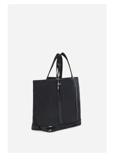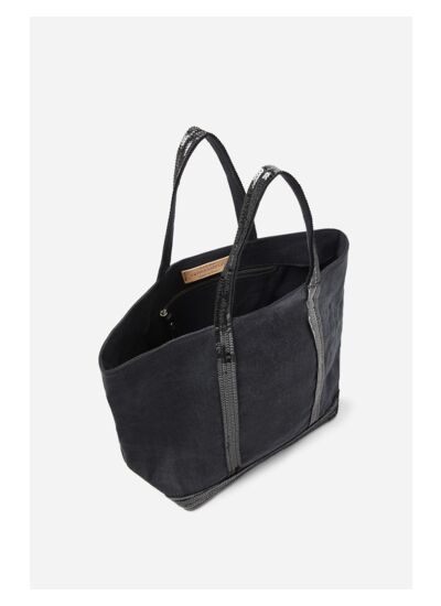 Une poche intérieure zippée surmontée d'une étiquette en cuir tannage végétal naturel avec un marquage à chaud estampillé 'Le Cabas Vanessa Bruno made in France'.