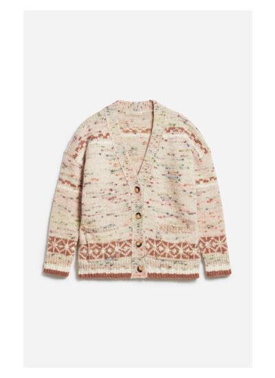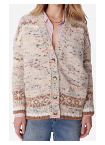 Inspiré par les pulls scandinaves aux motifs de tricot Jacquard, le cardigan Eleonore est irrésistiblement douillet. À porter en tenue cocooning chez vous ou pour prendre un café le weekend, cette pièce se démarque par sa maille mouchetée multicolore, son jeu de tricot et sa coupe ample. Porté à même la peau ou par-dessus une blouse, c',est la pièce versatile de la mi-saison, confectionnée dans un mélange prémium de laine, d',alpaga, de coton et de polyamide.