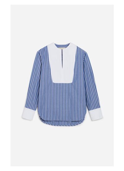La chemise Danny à rayures verticales bleu et blanc, avec des détails en tissu blanc contrastant, offre un look confortable et élégant. Dotée d',une coupe droite oversize, cette blouse est parfaite pour un jeu de contrastes masculin-féminin. Haussée d',un col tunisien et d',un empiècement en tissu blanc, elle crée un jeu de contraste visuel intéressant. Son tissu aérien, confectionné à partir d',un coton souple au toucher soyeux, apporte une touche féminine qui peut être mise en valeur selon vos envies. N',hésitez pas à la surtailler si vous souhaitez un look plus oversize. Portez-la sous un tailleur pour une tenue de bureau ou avec un bermuda plus ajusté pour un look décontracté et chic.