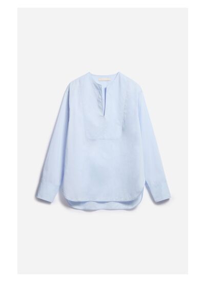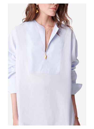 La chemise Danny est la seule chemise qu',il vous faut. Dotée d',une coupe droite oversize, cette blouse est parfaite pour un jeu de contrastes masculin-féminin. Rehaussée d',un col tunisien et d',un plastron ton sur ton, elle ajoute une touche de sophistication minimaliste. Son tissu aérien, confectionné à partir d',un coton mélangé souple au toucher soyeux, apporte une touche féminine qui peut être mise en valeur selon vos envies. N',hésitez pas à la surtailler si vous souhaitez un look plus oversize. Portez-la sous un tailleur pour une tenue de bureau ou avec un bermuda ajusté pour un look décontracté et chic.