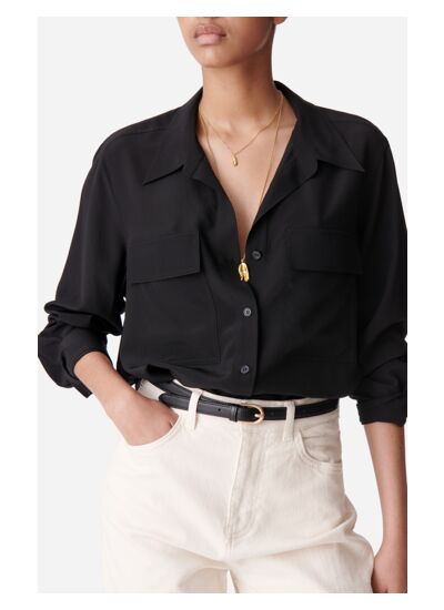La nouvelle chemise préférée de Vanessa. Pièce essentielle du vestiaire féminin, la chemise Demo est confectionnée en soie noire. Avec son allure masculine à l'esprit workwear, elle se distingue par ses poches plaquées au niveau de la poitrine. Sa coupe fluide offre une silhouette sophistiqué et minimaliste. Son col chemise, au boutonnage décalé, se porte volontairement ouverte pour une attitude nonchalante et moderne. Embrassez l'allure chic et décontractée en la portant légèrement surtaillée, de jour comme de nuit avec votre jean préféré.
