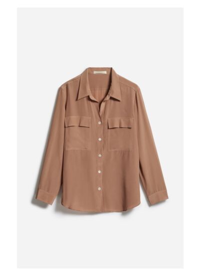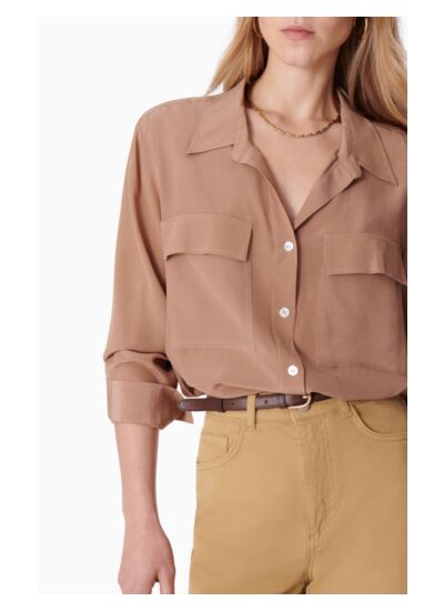 La nouvelle chemise préférée de Vanessa. Pièce essentielle du vestiaire féminin, la chemise Dim est confectionnée en 100% soie. Avec son allure masculine à l',esprit workwear, elle se distingue par ses poches plaquées à rabat au niveau de la poitrine. Sa coupe fluide offre une silhouette à la sophistiquée et minimaliste. Son col chemise, au boutonnage décalé, se porte volontairement ouverte pour une attitude nonchalante et moderne. Embrassez l'allure chic et décontractée en la portant légèrement surtaillée, de jour comme de nuit avec votre jean préféré.