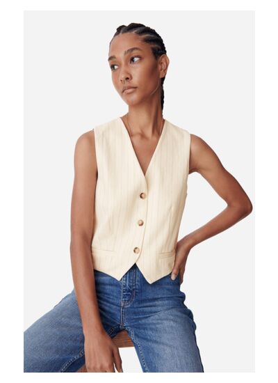 Cette veste sans manches aux boutons aspect corne joue avec les codes du style androgyne, et a tout pour devenir une pièce phare de cette collection. Portez-la tel quelle ou avec un crop top, ou sur une chemise fluide, la veste Benson est garante d',un style élégant et sans efforts.