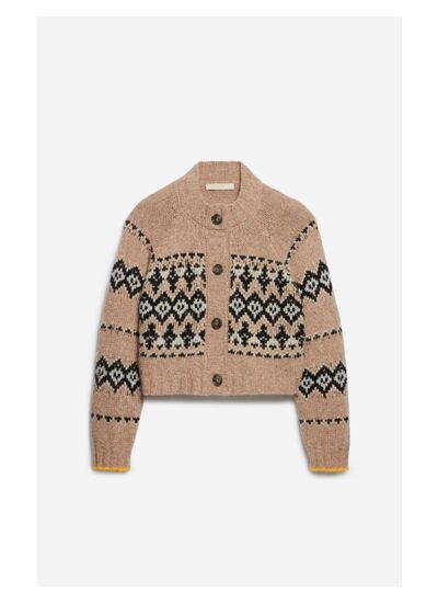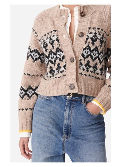 Le gilet Damas cropped en laine mélangée s'inspire du vestiaire de ski pour l'amener en ville avec style. Ses motifs géométriques et jacquard, évoquant les paysages de montagne, apportent une touche authentique et chaleureuse à votre garde-robe. Les détails jaunes sur le bord des manches ajoutent une note pop et moderne à cette pièce.