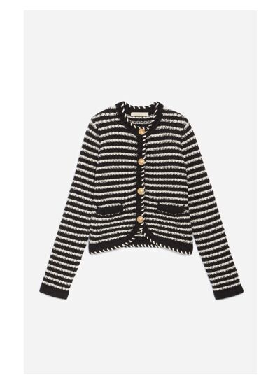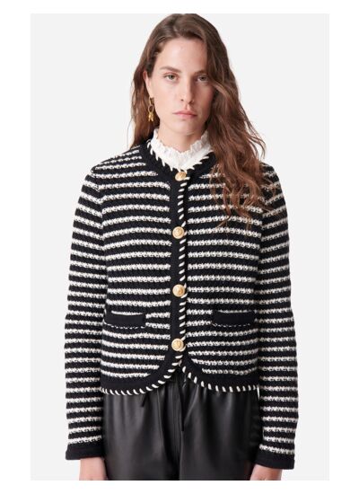 Le gilet Daya en tricot incarne le chic et l'élégance classique. Son tricot bicolore, noir avec des rayures horizontales blanches, fait de ce gilet une pièce classique à l'allure preppy. Sa coupe courte et ajustée offre une silhouette féminine. La fermeture à boutons dorés et les bords finement bordés d'un liseré contrastant apportent une note sophistiquée. Pour un look de bureau aussi simple que chic, portez-le avec un pantalon tailleur et une paire de kitten heels.