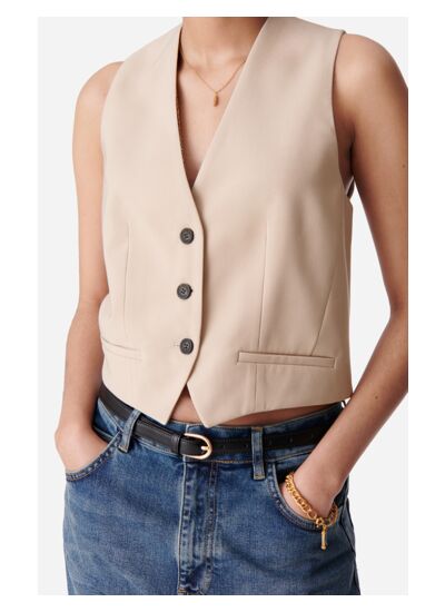 Quelle coupe et quel ajustement offre ce gilet ? La coupe cropped et structurée du gilet Benson dessine une silhouette féminine tout en s’inspirant du vestiaire masculin, avec un lien de serrage dans le dos pour ajuster la tenue selon vos envies.
