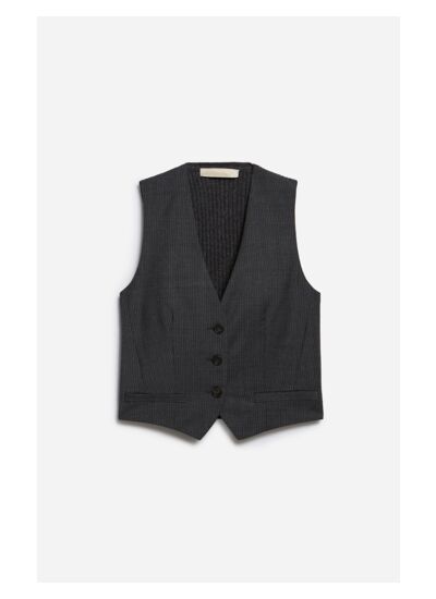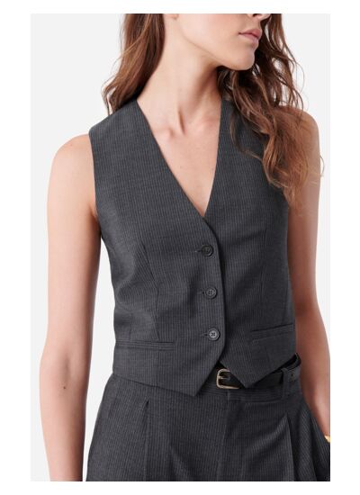 Le gilet de costume Denso sans manches, en coupe cropped, est un indispensable du vestiaire de la city-girl, alliant élégance et audace. Il réinvente les codes du costume classique avec une touche de modernité : tout en restant sophistiqué à l'avant avec ses fines rayures noires, il dévoile son tricot de laine côtelée à l'arrière. Ce détail inattendu ajoute une dimension intéressante qui ne manquera pas de susciter des compliments.Portez-le sous un costume pour une allure chic, sur un tee-shirt pour un look décontracté, ou directement sur la peau pour une tenue de soirée.