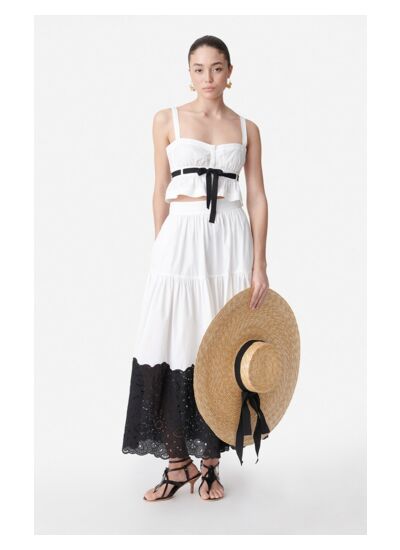 La jupe Aoda vous accompagnera dans toutes vos balades en Provence cet été. Ce modèle, volanté à trois étages, est revisité cette saison avec un volant en broderie anglaise sur le bas de la jupe pour apporter un jeu de transparence subtilement sensuel. Une pièce phare qui vous habille en un clin d'oeil. Portez-la avec le top Caraco pour un look assorti ou séparément avec un beau basique.