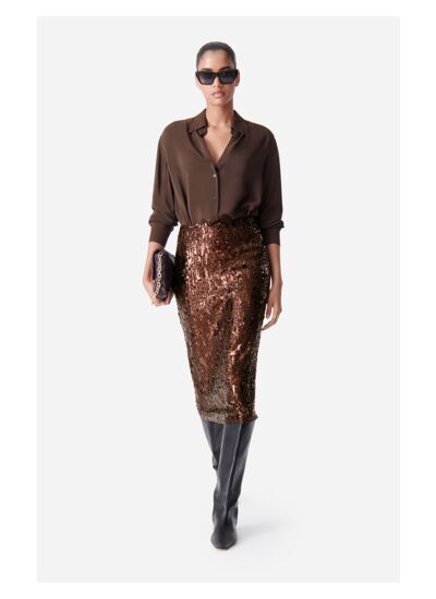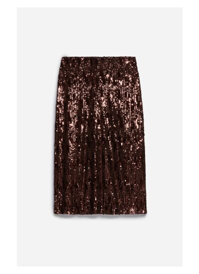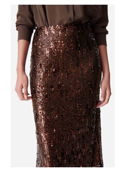 Absolument, la jupe Dirma est conçue pour briller lors de vos événements festifs grâce à ses paillettes qui captent la lumière. Sa coupe droite mi-longue et sa matière scintillante en font un choix idéal pour un look élégant et glamour.