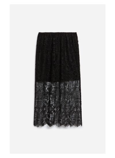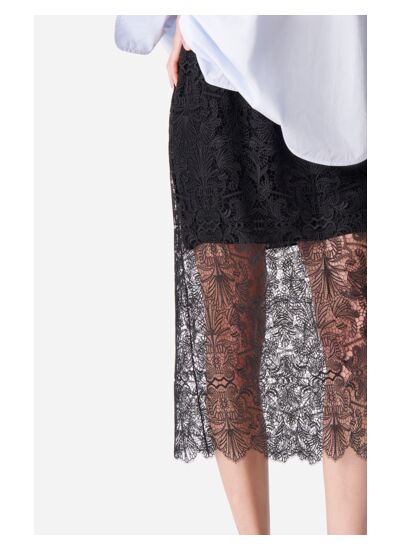 La jupe Douce joue de la tendance des jupes transparentes. Sa silhouette jupe crayon en dentelle longue dévoile vos jambes, alors son petit jupon noir en dessous permet d'apporter un constraste. Portez-la avec un t-shirt blanc et une paire de baskets pour un look décontracté, ou avec un haut noir et des escarpins pour un look chic, parfait pour une tenue de soirée.