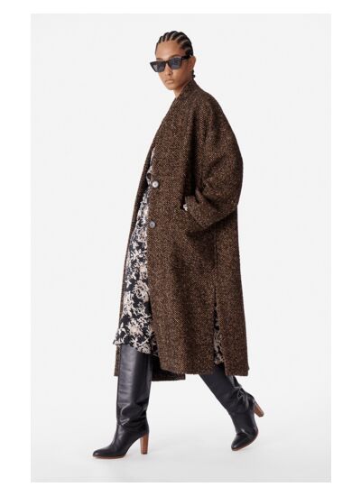 Le manteau présente un volume large et long avec des épaules tombantes et un col kimono, créant une silhouette élégante et moderne. Ses manches longues et larges ajoutent du caractère tout en assurant une grande liberté de mouvement.