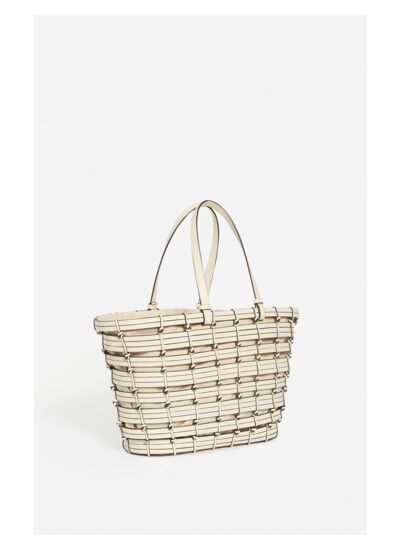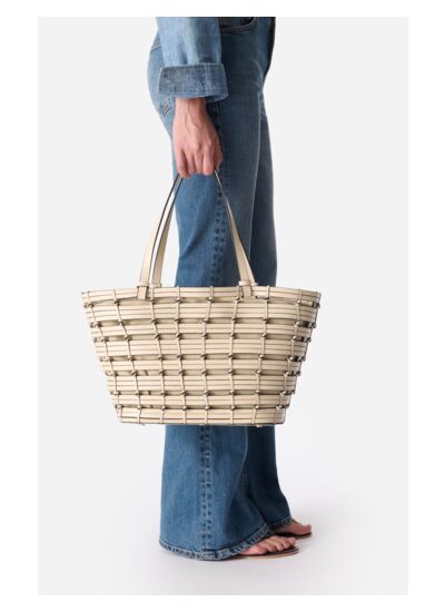 Ce panier en cuir tressé illustre l'alliance entre l'artisanat et le design contemporain. Fabriqué à la main, à partir de bandes de cuir,ce sac se distingue par son design en tissage complexe, créant une allure élégante. Chaque bande de cuir est soigneusement nouée. Son pochon en coton fixé à l'intérieur du panier qui se ferme à l'aide de cordon de serrage en cuir, rehaussés d'oeillets dorés.