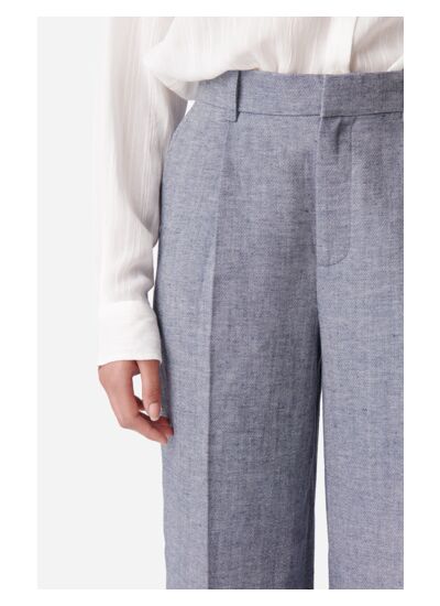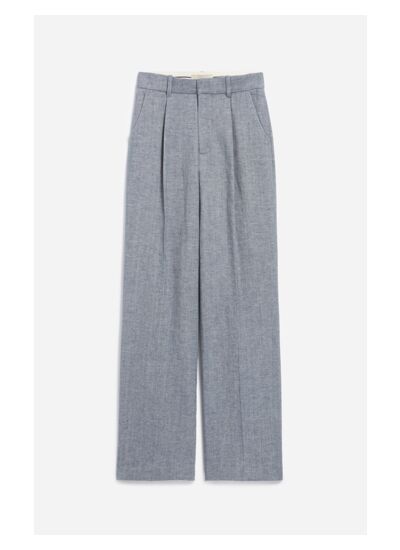 Ce pantalon à pinces arbore une ligne masculine, droite et large. Confectionnée en coton et en lin mélangé, cette pièce présente une texture subtile à l'aspect naturel. Avec ses plis sur chaque jambe, le pantalon Cyrano apportera une allure chic et décontractée à la fois. Décliné dans un colori bleu chiné, portez-le avec la veste Caline pour un deux-pièces impeccable.