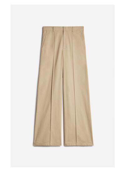 Ce pantalon se caractérise par sa coupe ample et fluide, qui allonge la silhouette avec élégance. Confectionné dans une toile de coton, il présente une taille mi-haute dotée de passants pour ceinture et une fermeture classique avec zip et agrafe. Les plis marqués sur la longueur ajoutent une touche de structure et de sophistication. Idéal pour une allure chic et contemporaine, ce pantalon peut se porter avec une chemise rentrée pour un look professionnel ou avec un haut décontracté pour une tenue plus casual. Une pièce polyvalente pour toutes les occasions.