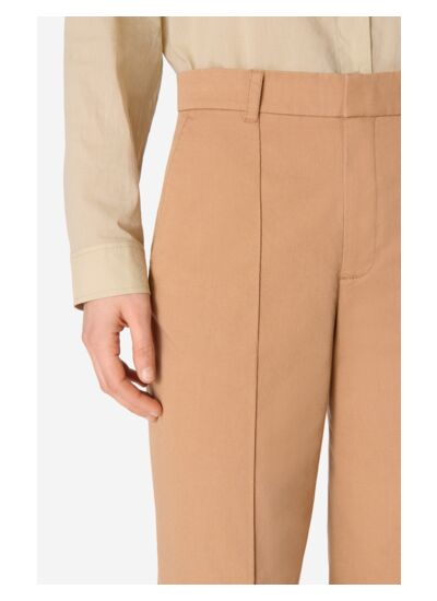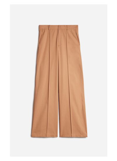Ce pantalon se caractérise par sa coupe ample et fluide, qui allonge la silhouette avec élégance. Confectionné dans une toile de coton, il présente une taille mi-haute dotée de passants pour ceinture et une fermeture classique avec zip et agrafe. Les plis marqués sur la longueur ajoutent une touche de structure et de sophistication. Idéal pour une allure chic et contemporaine, ce pantalon peut se porter avec une chemise rentrée pour un look professionnel ou avec un haut décontracté pour une tenue plus casual. Une pièce polyvalente pour toutes les occasions.