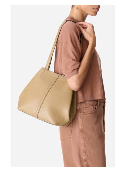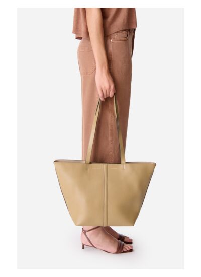 Ce nouveau Cabas en cuir, reprend l',esprit de notre sac Daily, avec un cuir de vachette lisse, ses coutures apparentes et son travail de plissage du cuir. Sa construction va à l',essentiel pour créer une silhouette épurée, que l',on peut fermer à l',aide d',un mousqueton doré, et que l',on déplie pour dévoiler un format Cabas. Ses anses rallongées ont été pensées pour que vous puissiez le porter à l',épaule, même avec votre manteau. Son petit plus ? Son aimant pour y ranger vos affaires les plus précieuses en toute sécurité.