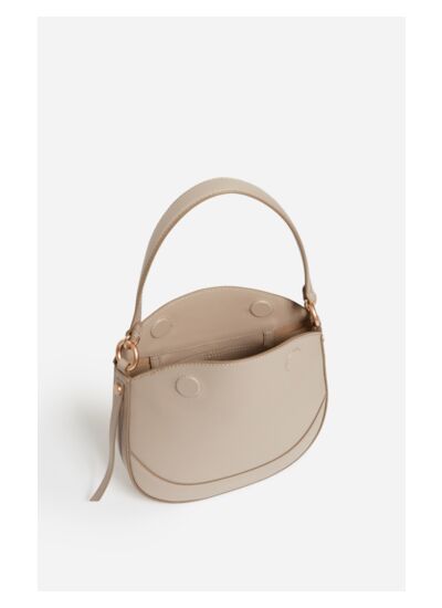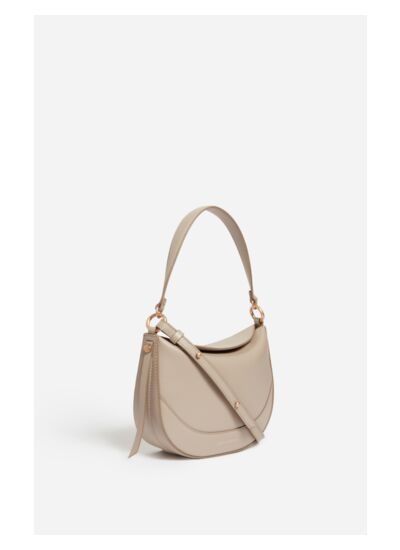 Mini sac demi-lune en cuir lisse. Porté main, épaule ou crossbody.
