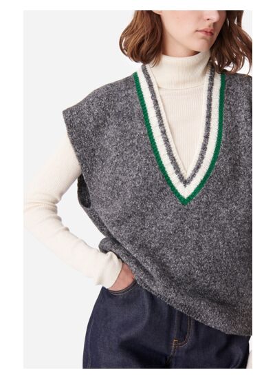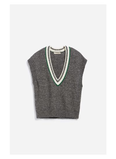 Le pull Daloba à manches courtes tombantes et amples s'inspire du vestiaire masculin et rétro. Confectionné en laine mélangée, ce modèle gris chiné se distingue par son col large en V, aux rayures blanc et vert, apportant du caractère à la pièce. Son tombé crée des lignes fluides et épurées pour une allure décontractée. Conçu pour être porté à même la peau ou superposé sur un t-shirt ou une chemise. Pour une touche féminine, associez-le à un short ou une jupe courte.
