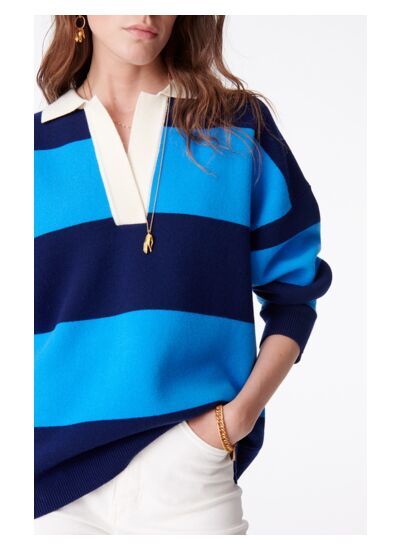 Le pull Dolly, qui tire son inspiration du polo de rugby traditionnel, se démarque grâce à ses larges rayures audacieuses et à sa coupe oversize, apportant une touche moderne et sportive à votre dressing. Grâce à son col polo en V contrastant en blanc, il propose un style à la fois décontracté et élégant. Fabriqué à partir de laine mérinos, il assure un confort et une douceur agréables tout en garantissant un bon maintien du vêtement. Le look de la saison : jouer des contrastes en associant ce pull esprit sportswear au très chic bermuda Damon.
