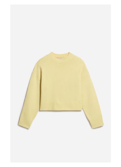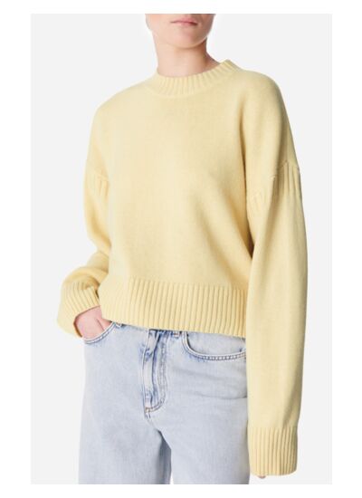 Confectionné en laine et yack, le pull Esther se distingue par son coloris jaune pastel, couleur tendance de la saison. Sa texture épaisse, confortable et raffinée, fait de ce pull votre compagnon privilégié pour vos journées froides. Sa coupe légèrement ample avec des manches larges raglans offre un tombé chic et décontracté. Boxy et cropped, on le porte aussi bien avec des jupes ou des pantalons.