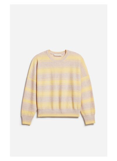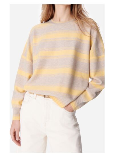 Confectionné en laine mérinos, ce pull à rayures jaune pastel et écrues est à la fois doux et lumineux. Sa coupe boxy légèrement ample assure un tombé impeccable, parfait pour des associations avec des pantalons, des jeans ou des jupes. Sa silhouette moderne et intemporelle en fait un indispensable de la saison.