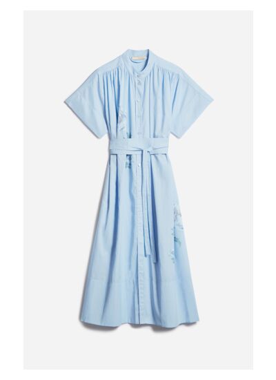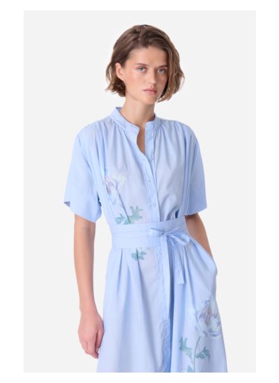 Vanessa Bruno revisite les codes de la robe-chemise avec un volume ample et rehaussé de fronces au niveau des épaules et dans le dos. Avec un col rond et une large ceinture à nouer, c',est la nouvelle robe indispensable de la maison. Confectionnée en coton et lyocell, cette robe rehaussée d',un imprimé floral sur le devant, vous accompagnera toute la saison lors de toutes vos occasions. Portez-la avec vos mules ou sandales préférées.