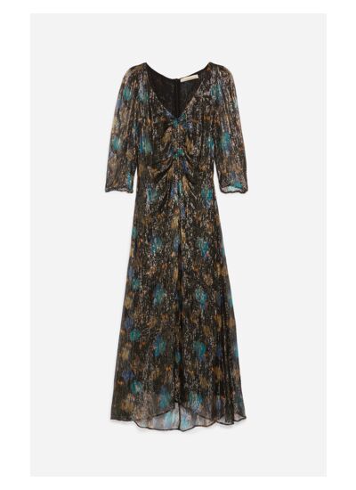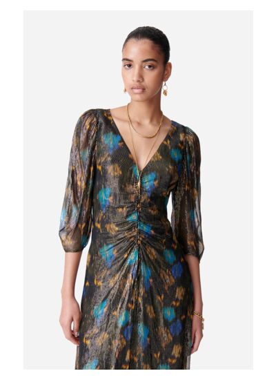 La robe Darcia est indispensable pour toutes vos occasions spéciales. Ses manches volantées et sa coupe fluide procurent une sensation aérienne qui enchante chaque mouvement. Elle apporte une dimension supplémentaire grâce à son voile délicat, tandis que son fronçage ajuste la robe à la taille, créant une silhouette à la fois ajustée et fluide. Sa palette de couleurs neutres est sublimée par des touches de fil doré et argenté, offrant de la dimension. Complétez votre look avec une paire de bottines pour scintiller tout au long de la nuit.