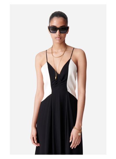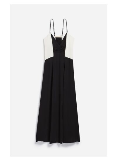 La robe longue Dragée vous incitera à dévoiler vos plus beaux pas de danse. Sa silhouette fluide, resserrée à la taille, est sublimée par une encolure en V profonde et un plissage délicat qui souligne un dos nu élégant. Confectionnée dans un mélange de viscose soyeuse et légèrement satinée, elle présente une finition brillante et une touche d'éclat. Les bretelles fines et délicates apportent une élégance supplémentaire, tandis que son style bicolore noir et crème la rend versatile et minimaliste.