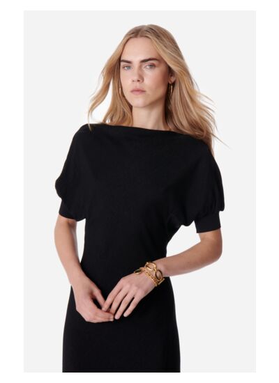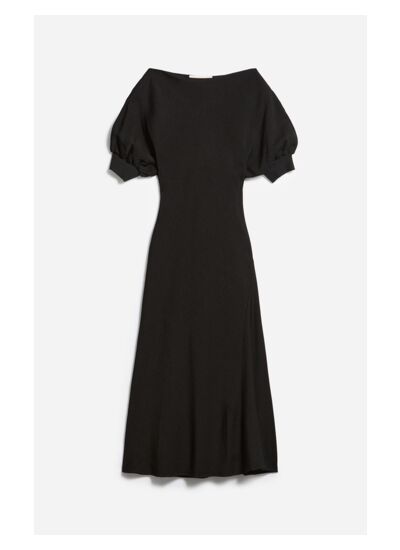 Elina est une robe mi-longue noire, à la silhouette minimaliste et élégante. Le haut de la robe est caractérisé par un col légèrement bateau, donnant un style raffiné et sophistiqué. Les manches courtes, resserrés avec une finition bord-côtes, ont une finition bouffante subtile, ajoutant une touche de volume au niveau des épaules. Confectionnée dans un voile de viscose crêpé, cette pièce présente un élégant tombé fluide et intemporel. Cette robe convient parfaitement pour des occasions formelles ou semi-formelles, tout en étant polyvalente grâce à sa simplicité.