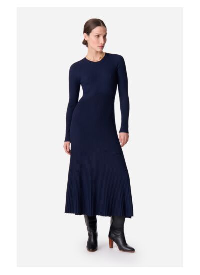Confectionnée dans une maille de viscose côtelée doux et extensible, la robe Elisa épouse la silhouette avec subtilité grâce à sa coupe ajustée sur le haut et évasée vers le bas. Dotée de manches longues et d',un col rond, cette robe bleue marine minimale évoque une allure sophistiquée, idéal pour la saison. Sa longueur midi apporte du mouvement, et se porte avec des bottes ou des escarpins selon vos occasions. Faites de cette pièce incontournable votre nouvel allié de style.