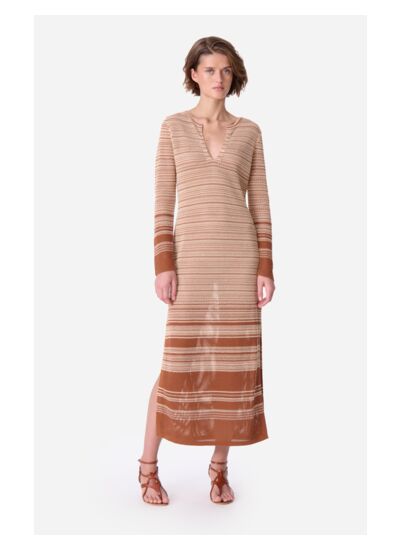 La robe Elly allie élégance et confort grâce à son tricot raffiné et sa coupe fluide. Ses rayures horizontales subtiles et ses fentes latérales lui confèrent une allure moderne et sophistiquée. Le décolleté en V et les manches longues ajoutent une touche de féminité, tandis que la taille marquée sublime la silhouette. Parfaite pour un look chic en journée ou en soirée, cette robe s',accorde aisément avec des accessoires neutres ou audacieux.