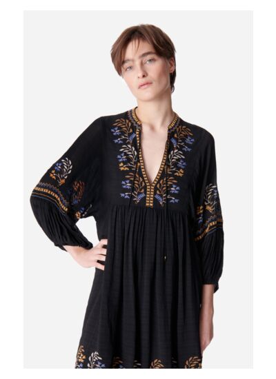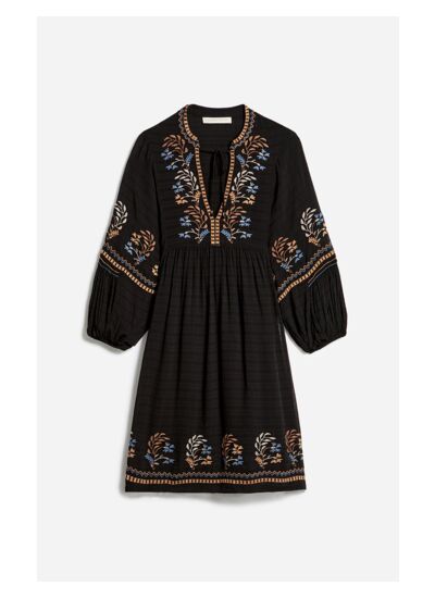 Dans l',esprit bohème inspiré des années 70, la robe Takis s',inscrit parfaitement dans les codes de la maison. Confectionnée dans un voile de viscose avec un jeu de jacquard légèrement transparent, cette pièce à la ligne fluide se démarque ici par ses broderies de fleurs au niveau du col et le long des manches.