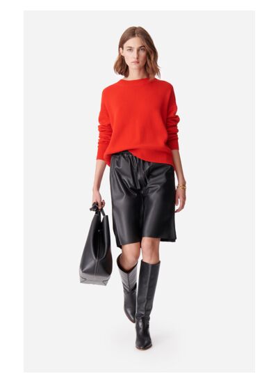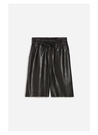 Le bermuda Damon apporte une touche rock à votre tenue. Confectionné en cuir de mouton avec une finition noire brillante, sa coupe masculine est féminisée grâce à sa coupe brute et sa taille ajustée avec une bande élastique. Portez-le avec un chemisier romantique pour créer un contraste féminin et masculin, casual et chic, ou avec une chemise masculine pour plus de structure.