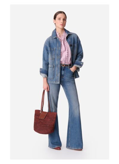 La veste Neli en denim bleu légèrement délavé combine style utilitaire et modernité. Avec sa coupe droite et oversize, elle offre un look à la fois décontracté et élégant. Ses grandes poches plaquées, ses surpiqûres contrastées et ses boutons visibles lui donnent un côté fonctionnel et intemporel. Dotée d'un col classique et de poignets retroussables, elle allie confort et style. Polyvalente, cette veste est parfaite pour des tenues chic et casual, idéale pour les journées de mi-saison.