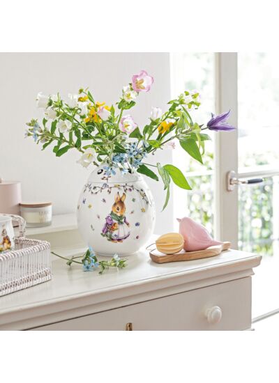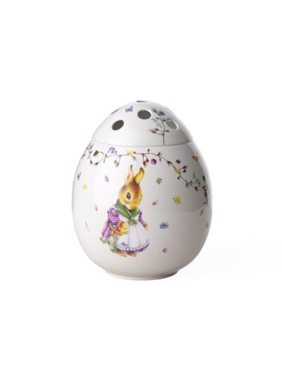 Avec la collection de Pâques Spring Fantasy, une joyeuse nostalgie se répand dans votre maison. D‘adorables lapins de Pâques s‘ébattent joyeusement dans les motifs imaginatifs et printaniers et confèrent à votre table un charme tout à fait particulier. Toutes ces pièces peuvent être merveilleusement combinées, collectionnées et offertes. Appréciez la plus haute qualité incarnée par Villeroy & Boch depuis 1748. Qu‘il s‘agisse de narcisses, de tulipes ou d‘autres fleurs printanières, à Pâques, nous voulons inviter le printemps dans notre maison. Avec ce vase en forme d‘oeuf, c‘est possible de manière particulièrement charmante, car grâce à son couvercle perforé, chaque fleur peut être magnifiquement présentée. Premium Porcelain. Laver de préférence à la main.