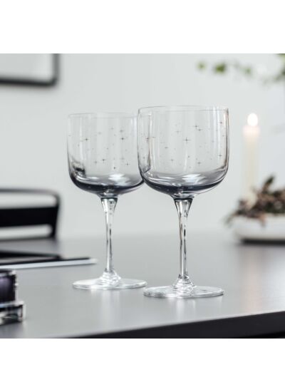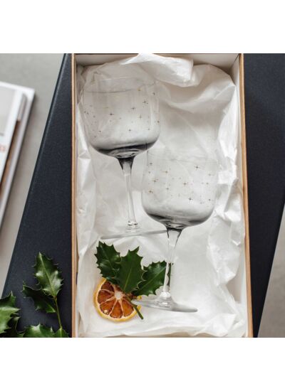 La collection Winter Glow recèle de pépites pour votre décoration de table à l’occasion des fêtes de fin d’année. Ainsi, cet ensemble de deux verres à motifs peut s’associer aux verres à eau, assiettes et bols assortis pour constituer un service de vaisselle complet. Agrémentez le tout de quelques décorations de Noël, de photophores ou encore d’une belle boîte à biscuits en forme de sapin : vous voilà prêt à recevoir vos convives dans une ambiance chaleureuse et festive ! Au premier abord, ces verres à pied ressemblent à des verres à vin classiques. Mais quand on les regarde de plus près, on aperçoit de jolis motifs étoilés ! Les petites étoiles dorées donnent à ces verres originaux un aspect scintillant et festif ! Ils seront parfaits sur la table dressée pour le réveillon de Noël ou du Nouvel An.