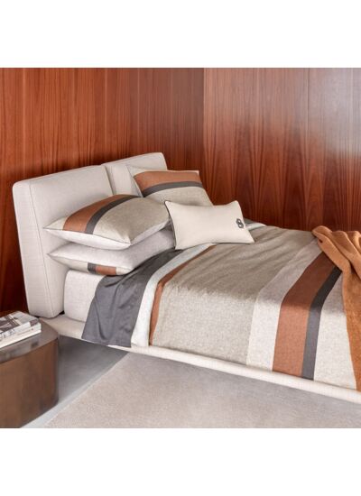L'imprimé Carlow évoque les beaux tissages de laine. De larges bandes dans des teintes naturelles et chinées, de grège à anthracite, avec quelques accents roux. Au revers, l'effet tissé grège, équilibre l'ensemble.