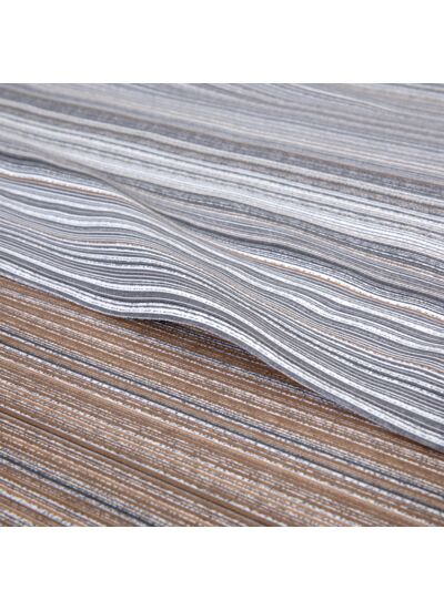 Ce spectaculaire effet de rayures, dans de multiples nuances minérales, d'intensités variables, s'illumine de passages craie. Le motif se déroule sur toute la hauteur, tandis qu'au revers, un uni gris chaud sublime le tout. Le satin de coton 120 fils utilisé, à la douceur incomparable, rend hommage à la richesse du dessin.