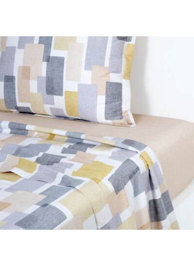 Un équilibre se crée entre teintes colorées chaudes et grises. Le tissu, imprimé sur un satin de coton 120 fils, est d'une remarquable fluidité. Il est habité d'un effet twill, repris au dos dans une lumineuse teinte de beige unie.