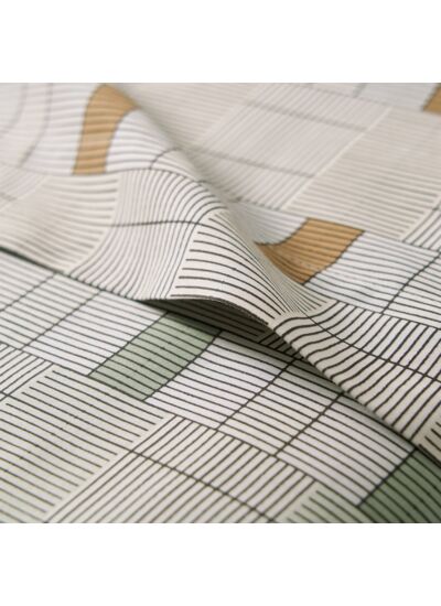 L'esprit du mouvement Bauhaus, aux lignes épurées, souffle sur ce dessin précis et graphique. Des stries dessinées à la pointe accueillent de petits pavés colorés, dans une succession de tons camel et vert kaki. Au revers, un faux uni dans le même ton.