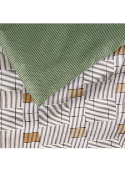 L'esprit du mouvement Bauhaus, aux lignes épurées, souffle sur ce dessin précis et graphique. Des stries dessinées à la pointe accueillent de petits pavés colorés, dans une succession de tons camel et vert kaki. Au revers, un faux uni dans le même ton.